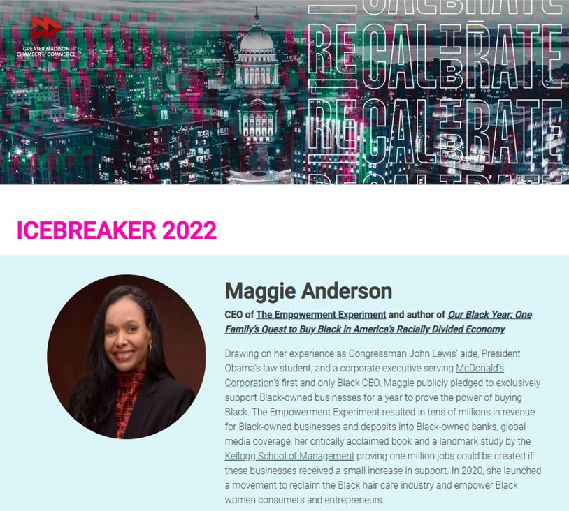 The Greater Madison Chamber of Commerce's annual 'IceBreaker' luncheon is the region's signature business event. Presented at the dazzling Kohl's Center, VIP business, political, and community leaders have been waiting three years for its return. With COVID and racial inequality dominating the business dialogue, GMCC offers the "Recalibrate" theme and Maggie as the keynote speaker. Tickets sell fast. Be there for this rare in person keynote speech! You don't want to miss this.